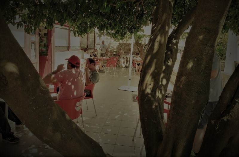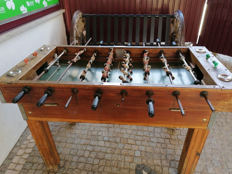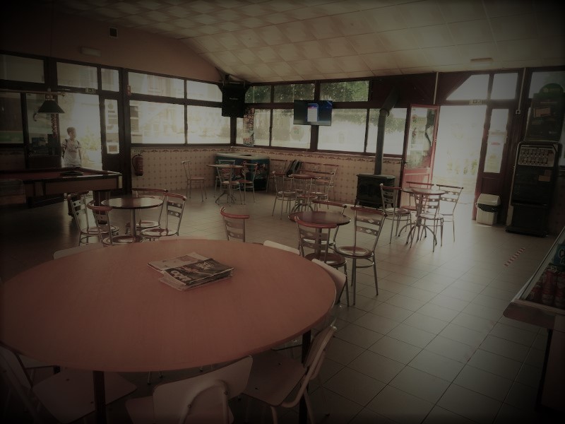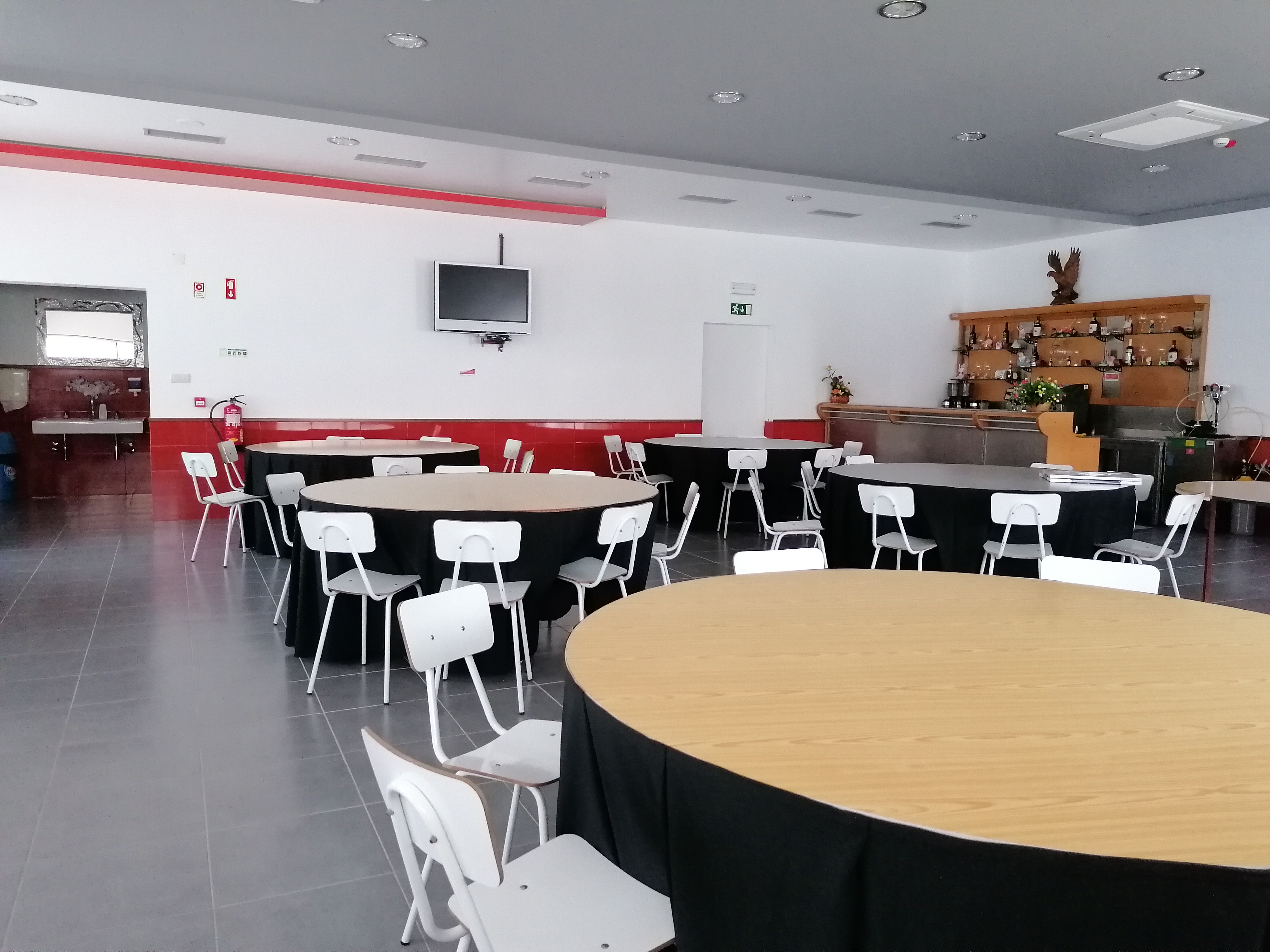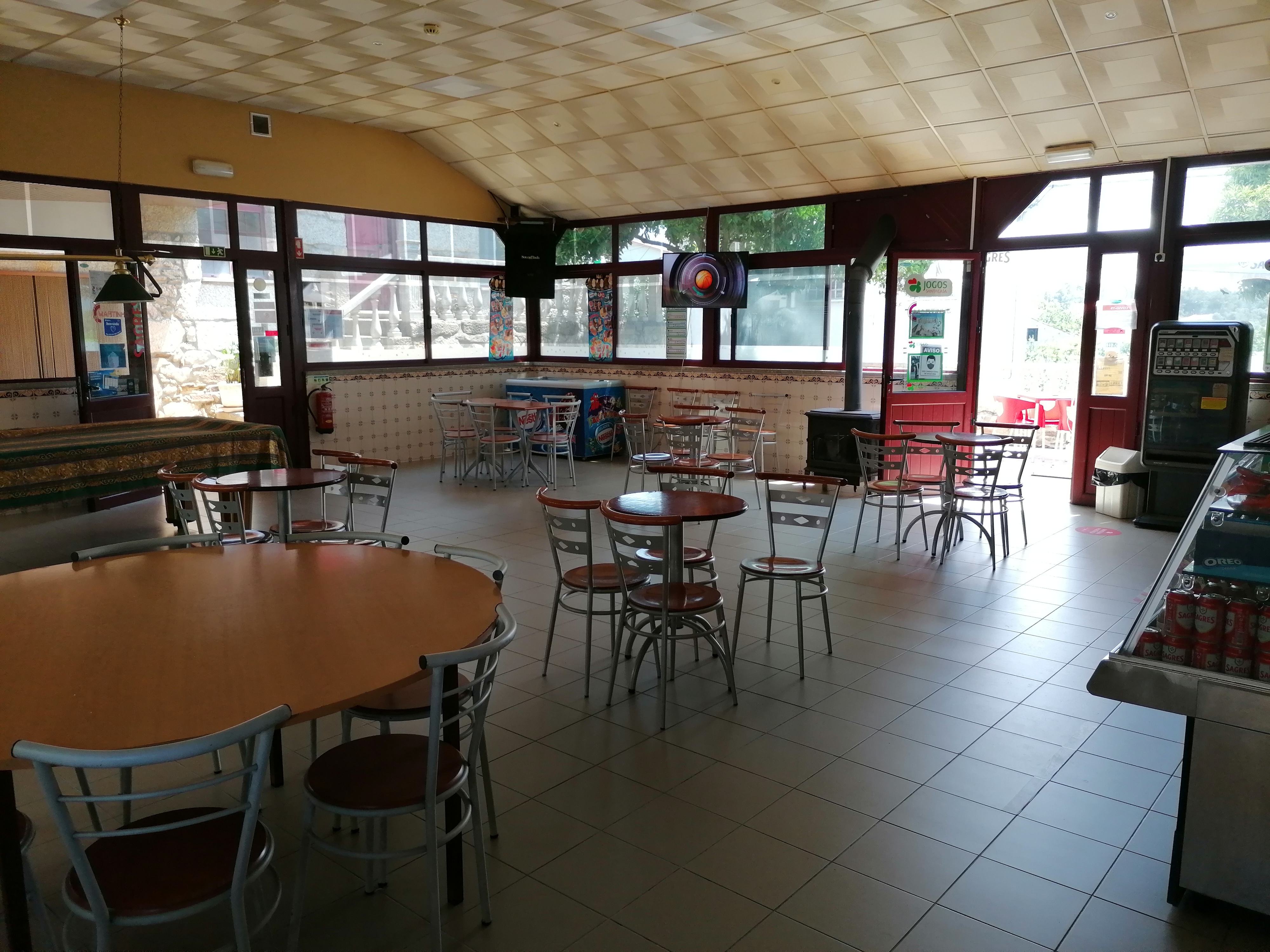 Bar interior, com salão de jogos (snooker, matraquilhos, cartas) e terraço .